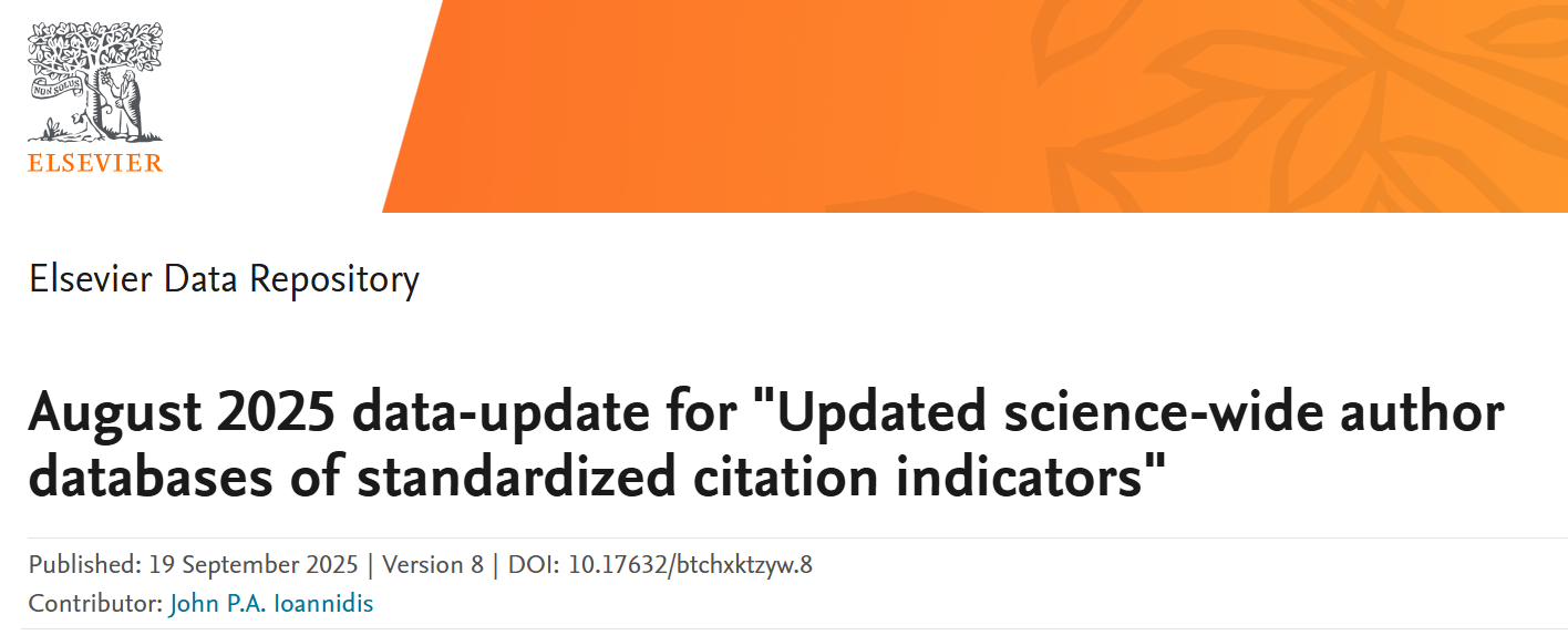 2025年9月19日,斯坦福大学(Stanford University)与国际权威学术出版社(Elsevier)共同发布2025年全球前2%顶尖科学家榜单(World's Top 2% Scientists),分为“终身科学影响力排行榜(Career-long Impact)”和“年度科学影响力排行榜(Single-year Impact)”两大部分,其中终身榜单聚焦学者学术生涯的综合影响力,年度榜单关注学者上一年度的学术成就。该榜单基于引用次数、H因子、合著者修正的hm因子等6项指标,从全球700万名科学家中遴选出世界排名前2%的科学家。我院江霞教授、代忠德教授、孙登荣研究员、朱祥研究员入选“年度科学影响力排行榜”。