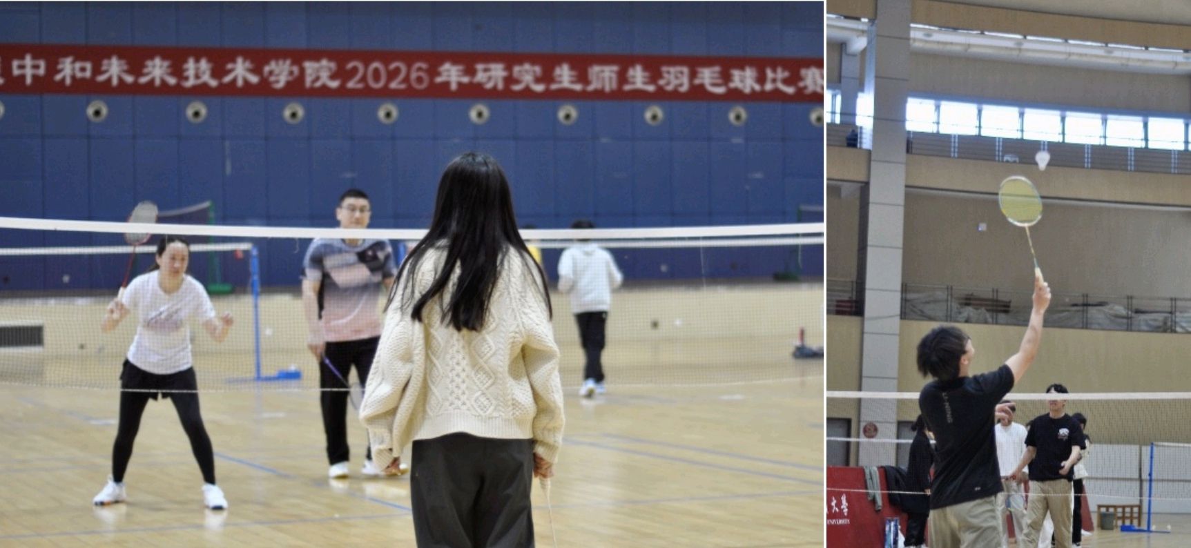 比赛现场气氛热烈,师生们步伐矫健、配合默契。白色羽球凌空穿梭,高远球、网前吊球、凌厉扣杀轮番上演,比分交替攀升,场边喝彩与掌声不断。